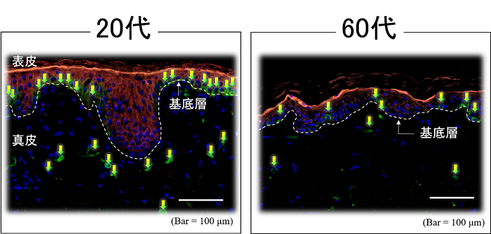 20代と60代の皮膚の幹細胞について比較したところ、20代に比べて60代では、皮膚の幹細胞が大きく減少していることが分かりました(緑色の矢印)。