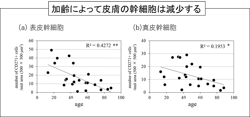 皮膚の幹細胞の減少は、皮膚の再生能力の低下させ、皮膚の老化や疾病の発症に大きく影響を及ぼすと考えられます。