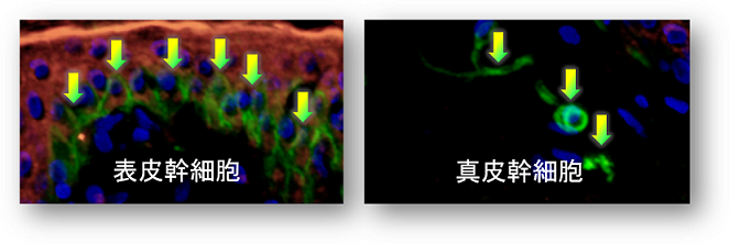 さらに詳しく観察してみると、表皮幹細胞は基底層に存在し、乳頭層の頂上付近に存在していることが分かりました。また、真皮の幹細胞は真皮の上層部、乳頭層に点在していることが分かりました。どうやら、皮膚の幹細胞が存在する部位は決まっているようです。