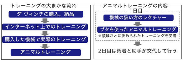 ダ ヴィンチの正式なトレーニングはダ ヴィンチを買った人しか受けることができません。ダ ヴィンチを購入し、納品されるとまずはインターネット上でのトレーニングを受けることになります。その後自分で購入したダ ヴィンチを用いて4〜5時間のトレーニングを受け、その後にアニマルトレーニングをするというのがダヴィンチトレーニングの大きな流れとなります。