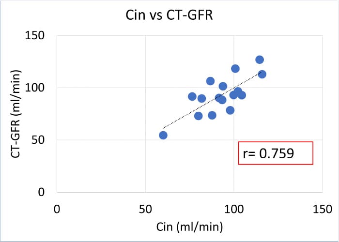 生体腎移植のドナー適応を判断するためには,正確な腎機能の評価が大切です.通常は採血と蓄尿を組み合わせた検査を行いますが,非常に煩雑な検査です.そこで私たちは造影CTを使用して腎機能検査を行えるよう研究をしています.造影CTはドナーとなられる患者さんに基本的に受けていただく検査であり,検査時間も短時間です.施行した症例では,従来の検査と強い相関を示しました.