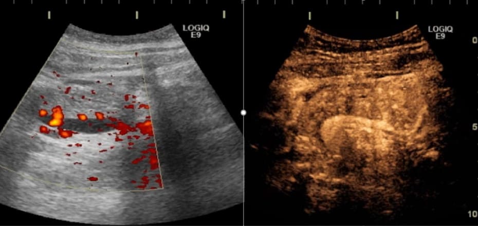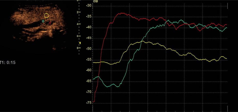 体内の静脈血流を測定することは非常に難しいのですが,当科では造影超音波を使用することで血流の評価を可能としました.