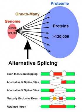 Alternative splicing allows the generation of multiple mRNAs from a single gene by changing the way of the pre-mRNA splicing, and the number of combinatorial patterns of splicing increases tremendously as the number of introns increases. In humans, alternative splicing is a successful major strategy for expressing the full proteome, with at least 120,000 kinds of proteins expressed from an unexpectedly small genome containing 20,500 genes at most (see left figure). Recent studies have revealed that over 90% of human genes undergo alternative splicing, which is spatiotemporally regulated on demand.