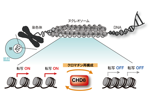 染色体(クロマチン)は、DNAをヒストンというたんぱく質に巻き付けて(ヌクレオソーム)、高度に折り畳んで収納したものです。CHD8は、この染色体の構造を変化させるクロマチンリモデリング因子というたんぱく質の一種で、様々な遺伝子の発現を調節することが知られています。