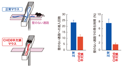 さらに、不安様行動を調べるために、高架式十字迷路テスト(※5)を行ったところ、CHD8半欠損マウスでは、不安・恐怖を感じる場所である壁のない通路への進入回数と滞在時間がいずれも減少していました(図4)。この結果から、CHD8半欠損マウスでは不安様行動が著しく増加していることがわかり、これらはヒトの自閉症患者でみられる症状と合致しました。