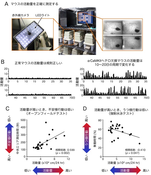 (A) マウスの活動量を測定するシステム。ケージのふたに付いている赤外線カメラで撮影した画像をコンピュータで自動解析してマウスの移動距離を正確に測定します。(B) αCaMKIIヘテロ欠損マウスの活動量は、正常マウスに比べて高く、かつ、10〜20日の長期的な周期を示します。(C, D) 活動量を測定した後、オープンフィールドテストと強制水泳テストを行い、不安様の行動注7)とうつ様の行動注8)を調べました。(C) 活動量の高い時期のαCaMKIIヘテロ欠損マウスはオープンフィールド装置の中央エリアでの滞在時間が長く、不安様行動が低い一方で、活動量の低い時期は中央エリアでの滞在時間が短く、不安様行動が高い傾向にあります。(D) 活動量の高い時期のαCaMKIIヘテロ欠損マウスは強制水泳テストでの無動時間が短く、うつ様行動が低い一方で、活動量の低い時期は無動時間が長く、うつ様行動が高い傾向にあります。
