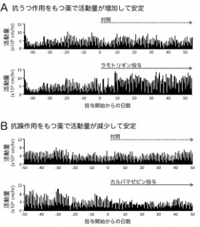 このマウスの活動量は、ヒトの双極性障害の治療で使われている気分安定薬に反応して安定することが明らかとなりました。(A) 抗うつ効果をもつラモトリギンを投与すると、投与前に比べて活動量は増加し安定しました。(B) 一方、抗躁効果を持つカルバマゼピンの投与で活動量は減少し安定しました。グラフでは、各処置グループ9〜11匹のマウスの活動量の平均した値を示しています。