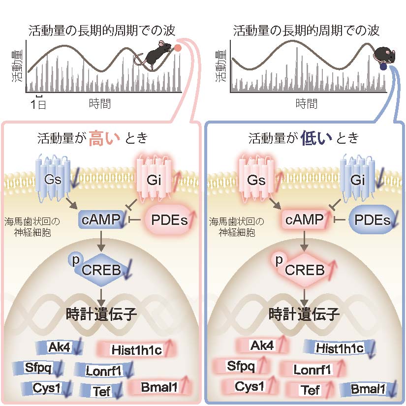 本研究では、気分の調節に重要な役割を持つ海馬歯状回において、時計遺伝子の発現量が活動量と同期して長期的な周期で変動することを発見しました。さらに、その調節機構のひとつとしてcAMP/CREB経路が見出されました。赤色の上向き矢印は増加を、青色の下向き矢印は減少を示します。これらの分子変化は、“気分の波”の脳内分子基盤の一部であると考えられます。