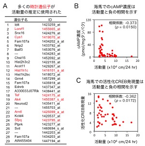 (A) 過去24時間の活動量の推定に使われた遺伝子のリスト。活動量を高い精度で推定するのに使用された遺伝子の中に時計遺伝子(赤字)が多く含まれていることを発見しました。また、活動量の高い時期は海馬歯状回でのcAMPの濃度 (B)および活性化CREBの量 (C)が低く、活動量の低い時期は逆に高く、負の相関関係にあることがわかりました。