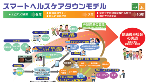 「意識せずに健康になれる社会、スマートヘルスケアタウンの実現」のために、ドラッグストアでの眼底画像検査や、健康診断、食習慣、薬歴データなどの管理プラットフォームの構築により、疾患の早期発見・治療やリスク予測などにアプリを活用する仕組みの構築を目指します。豊明市、スギ薬局、トプコン等の自治体、企業と協働して、未病早期発見/先制医療の実現に向けた研究開発を進めます。