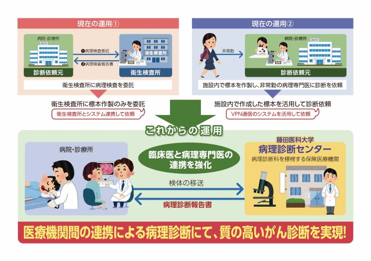 病理医は慢性的に不足しており、また求められる診断が高度化しているため、病理医にかかる負担の大きさが問題になっています。そこで、病理診断の質の向上に寄与し地域医療に貢献することを目的に、藤田医科大学病院は、2022 年 4 月に地域の医療機関の病理診断を支援する「病理診断センター」を開所しました。同センターでは、地域の医療機関から依頼を受け、患者さんから採取された検体をもとに良性・悪性の鑑別、治療の選択、予後の判断にかかわる情報の提供を含む病理診断業務を担います。これにより、病理医が不在のクリニック等でも患者さんに品質の担保された医療を提供できるようになり、地域の質の高い医療提供に貢献しました。