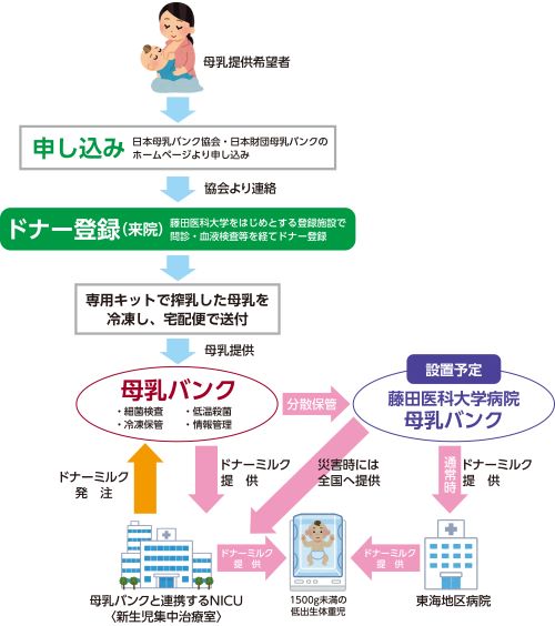 現在、日本母乳バンク協会および日本財団母乳バンクは東京の 2 カ所のみであるため、通常時は東海地方の NICU への発送を行い、災害時など東京のライフラインが停止した時には藤田医科大学病院から全国の NICU に母乳を届けます。