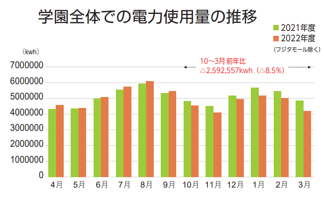 本学は、エネルギーミックスのチューニング等を行い、継続的に施設全体で、一次エネルギー使用の抑制を進めています。