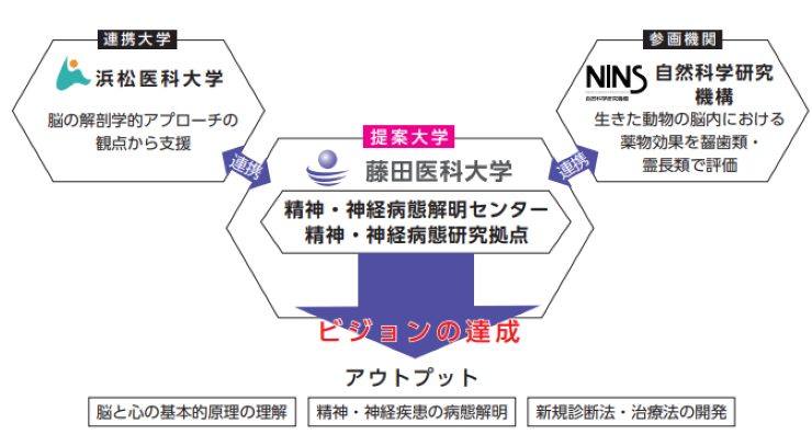 この事業は、我が国全体の研究力の発展をけん引する研究大学群の形成を目的としたもので、本学は浜松医科大学、自然科学研究機構(岡崎地区)と連携し、精神・神経病態研究拠点の成果を核とし、脳と心の基本原理の理解、精神・神経疾患の病態解明、新規診断法・治療法の開発、次世代人材の育成と大学の国際化を行うための産学官連携・共同研究施設を整備します。