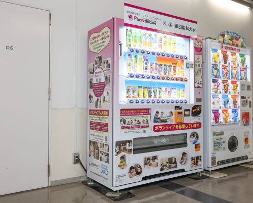 SDGs推進室は、大学ボランティアセンターと共に、認定NPO法人プラス・エデュケート*に売上の1%を寄付できる自販機の学生食堂周りへの設置に協力しました。本学の学生も学習支援ボランティアに参加する様子やボランティア募集のメッセージがオリジナルラッピングされており、寄付金は学習に関わる諸費用や生活困窮児童の授業料補助などに使われます。