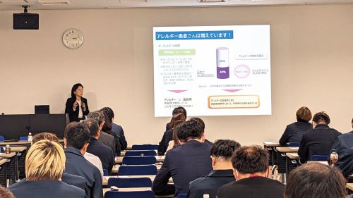 2023 年 11 月にはホーユー株式会社で、2024 年 3 月には株式会社アイシンで、アレルギー疾患の知識や対処法についての勉強会を開催し、自身がアレルギーである方、業務に関連するアレルギーを持つ方、アレルギー罹患児の親である方等、管理職 / 従業員を対象に、アレルギーの予防や治療、付き合い方を解説し、職場全体でアレルギー対策 / 予防に取り組むことの重要性を呼びかけました。