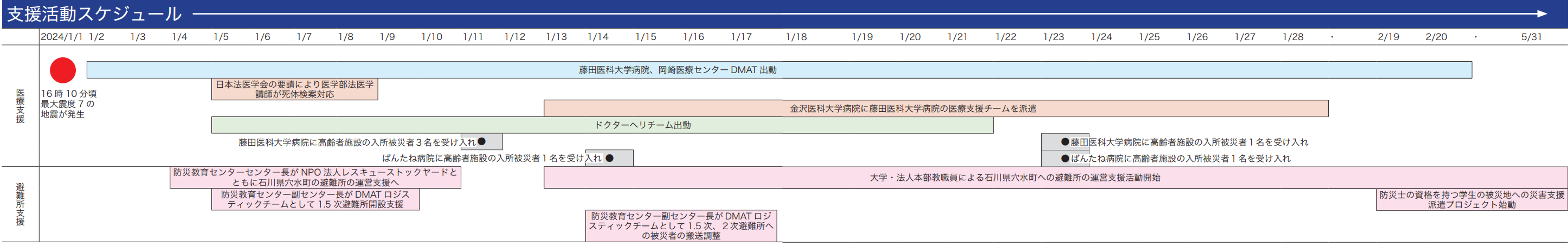 2024年1月1日に発生した能登半島地震による災害をうけ、藤田医科大学病院は発災直後から救護班の派遣や救援物資および患者さんの搬送など、医療支援や避難所支援に取り組みました。