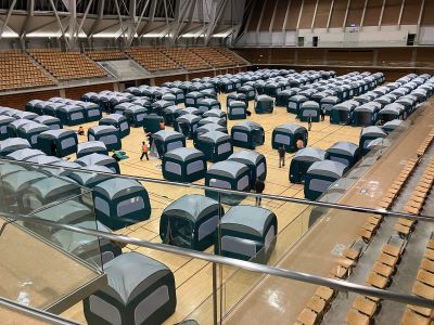 いしかわ総合スポーツセンターでの1.5次避難所の開設を、本学の防災教育センターが支援。避難者が過ごすテントのレイアウト作成や、現場立ち上げ時のミーティングの進行、最初の避難者の受け入れなどを担当しました。