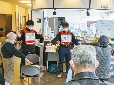穴水町の避難所で学生たちが集団体操を指導する様子