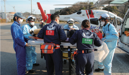 2024年3月14日、藤田医科大学病院のドクターヘリ運航開始に伴い、常滑市消防本部と初の合同連携訓練を実施しました。訓練では、同消防本部にドクターヘリを離着陸させ、事故発生時に適切な活動を行うための連携手順を確認しました。ドクターヘリの目的は、救急現場へ医師、看護師を派遣することで初期治療までの時間を短縮することです。その中で消防が早期に現場状況を把握し、要請する役割は非常に重要です。