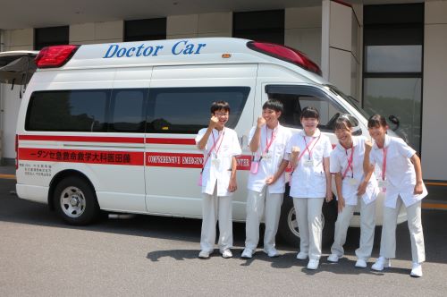 2024 年 6 月 12 日 ~ 13 日、職場体験学習の一環として、豊田市立朝日丘中学校の2年生5名が、藤田医科大学病院で看護師の仕事を体験しました。初日は、手洗い研修や車いす・ストレッチャーなどを使用した患者搬送や聴診器・心電図などの看護技術を体験しました。2日目は病棟で働く看護師に同行しての患者さんへのケアの見学とともに、AEDによる一次救命処置を学びました。