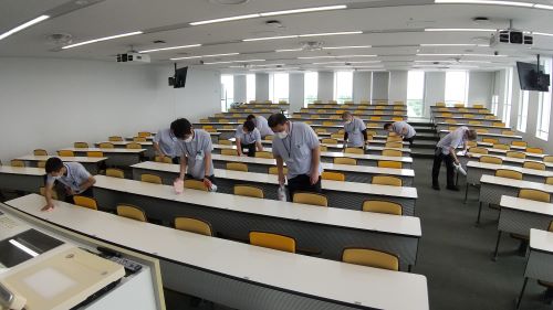 2021 年度結成の「スマイルチーム」は、障がいを持つ方とサポートスタッフで「互いを理解し・受け入れ・認め合う」職場づくりに取り組んでいます。2023 年度はさらに 2 名を増員し、総勢 17 名となりました。応募希望者へは、見学説明会や体験会の実施を通して、安心してご応募いただき、アドバイザーである作業療法士の支援も受けながら、入職後も手厚いフォローを実施しています。メンバー増員に伴い、これまで実施していた大学構内の清掃活動範囲を広げ、シュレッダー作業、消耗品補充に加え、学内報や一部の学内郵便物の仕分配付作業、書類・封筒・申込書などへの押印作業も実施し、業務の幅も拡大しました。今後も本学構成員の誰もが生き生きと働ける職場づくりに取り組みます。