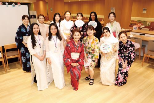 2023 年 8 月、本学に在籍する留学生に日本文化を体験してもらうため、本学国際交流推進センターが夏文化フェスタ 2023 を開催しました。学生食堂に母国の民族衣装を身にまとった、留学生・学生・教職員ら 7 カ国約 70 名が来場しました。学生・職員による和楽器演奏などの日本文化や、留学生による出身国・地域の民族衣装の紹介、「食」の多文化交流として、各国の料理が振る舞われるなど、留学生と学生・教職員の交流を深めました。本学では、様々なルーツを持つ学生・教職員が、よりよいキャンパスライフを過ごせるよう取り組んでいます。