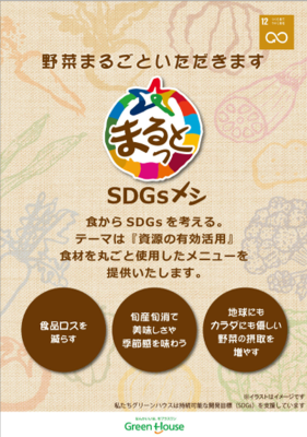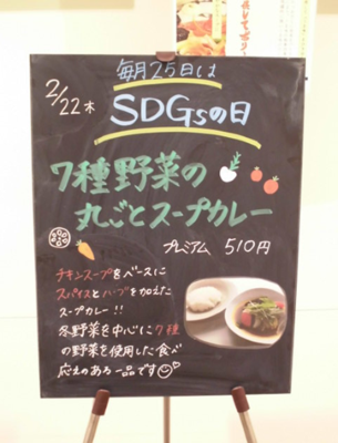 SDGs の啓発を目的に、本学の職員食堂では、毎月 25 日に「美味しく、健康に」をテーマに掲げ、ベジメニューを提供しています。相対的にカーボンフットプリント * が低いと言われている野菜をメインに献立が考えられており、野菜は基本的に皮をむかずに使用することでごみを減らし、栄養もより多く摂取することが可能となります。野菜は蒸すことで形を残し、より満足感が得られるような工夫も凝らし、廃棄で出た野菜の皮は、ラーメンスープの出汁(ベジブロス)にて使用しております。美味しさや季節を楽しむ旬産旬消を推進し、生産や保存に係るエネルギー抑制の効果も期待できます。食品ロスの削減を通して、ごみの削減、温室効果ガスの削減に貢献してまいります。