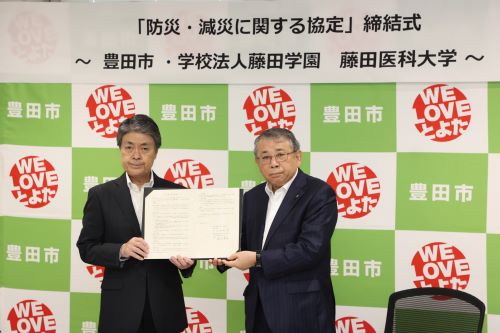 2023 年 8 月、本学と豊田市は「防災・減災に関する協定」を締結。同市における防災教育の拡充を通して、市民の健康、救命に貢献します。
