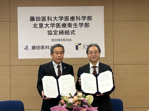 2023 年 6 月、本学の医療科学部と北里大学医療衛生学部は協定を締結。人材育成と教育研究等の充実を図り、もって両学部と地域社会の一層の発展に寄与することを目指します。