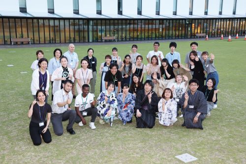 本学に在籍する留学生に日本の文化を学び・体験してもらうことを目的に国際交流推進センターが夏文化フェスタを開催し、留学生・本学学生・教職員ら約40名が参加しました。 百人一首、すいか割りなど日本の文化を体験したほか、ルワンダからの留学生が自国の伝統的なダンスを披露するなど、各国の文化を紹介し合いました。最後にはフジタモール前の芝生広場で全員が輪になり盆踊り。指導役の学生の音頭に合わせて、ぎこちない動きながらも、笑顔いっぱいで踊りました。