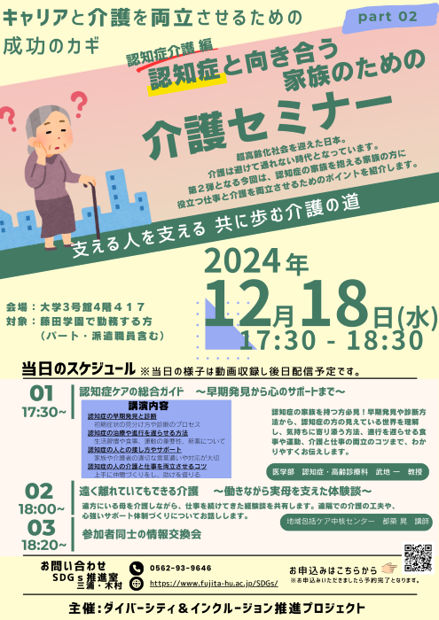 2024年12月18日、本学では教職員(パート・派遣職員含む)を対象に第2回目の介護セミナー「認知症介護編」を開催しました。