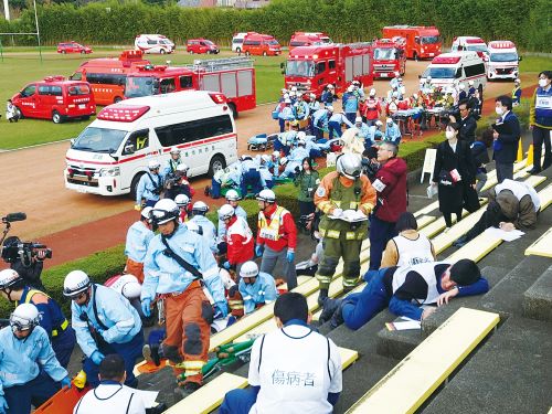 藤田医科大学は、2024年11月8日、名古屋市消防局と共同でドクターヘリを用いた初の実動訓練を実施しました。この訓練は、集団災害発生時における消防機関との連携を強化することを目的に行われ、イベント会場で発電機が爆発し、重症・軽症含む19名の負傷者が発生したという想定で進められました。緊急対応として、総合フジタグラウンドに、消防車両21両、救急車両18両、消防ヘリ1機、警察車両が出動。藤田医科大学病院のドクターヘリチーム(医師2名、診療看護師1名、看護師1名)が駆け付け、現場でのトリアージや応急処置、救急搬送を実施しました。本学職員10名が傷病者役として参加し、リアルな演技で訓練を支援。実戦さながらの環境で対応力を強化しました。地域と連携したリアルな訓練をすることができました。