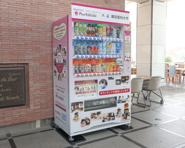 SDGs推進室は、大学ボランティアセンターと共に、認定NPO法人プラス・エデュケート*に売上の1%を寄付できる自販機の学生食堂周りへの設置に協力しました。本学の学生も学習支援ボランティアに参加する様子やボランティア募集のメッセージがオリジナルラッピングされており、寄付金は学習に関わる諸費用や生活困窮児童の授業料補助などに使われます。