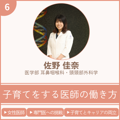 耳鼻咽喉科・頭頸部外科学の医師として研鑽を積みながら、生後11カ月の男の子の子育てにも全力で向き合う専攻医の佐野先生。出産を経て時短勤務を選択し、家族や医局のサポートを得ながら、自分らしい働き方を模索されています。妊娠中の葛藤、育休からの復帰、不安との向き合い方、そして限られた時間の中で仕事の質を高める工夫とは——。子育てと医師としてのキャリアの両立を目指す未来の医師・若手医師に向けて、リアルな経験と思いを語っていただきました。
