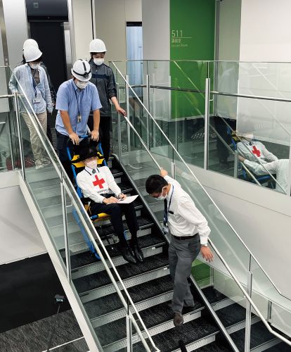 階段を下りられる専用の椅子担架でケガ人を搬送