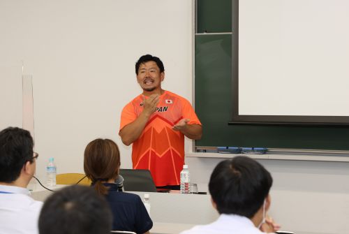 2025年10月1日、本学地域共生社会推進センターは、陸上競技ハンマー投げの石田考正選手を招き、特別講演会を開催しました。石田選手は、聴覚障がい者の国際スポーツ大会であるデフリンピックの前回大会で金メダルを獲得した選手です。講演会は、11月15日から日本で初めて開催される「東京2025デフリンピック」を前に実施されました。会場には約50名の教職員が集まり、手話による拍手で石田選手を迎えました。石田選手は、競技の魅力やこれまでの経験について、手話通訳を通して語りました。