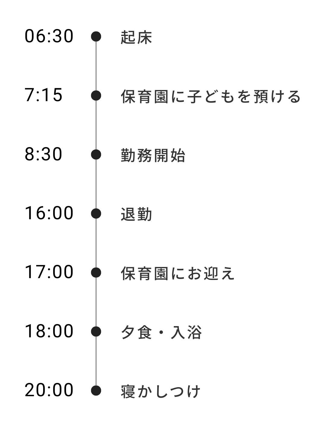 朝6時30分に起床し、7時15分~30分に保育園に預けて、8時30分~9時に勤務開始します。週30時間の勤務で考えると15~16時くらいまで仕事をして、 17時過ぎに迎えに行き、夕食とお風呂を済ませて19時30分~20時30分の間に寝かしつけています。 保育園がすごくあそばせてくれるところなので、朝寝、昼寝、夕寝もしていますが、 夜もぐっすり寝てくれます。