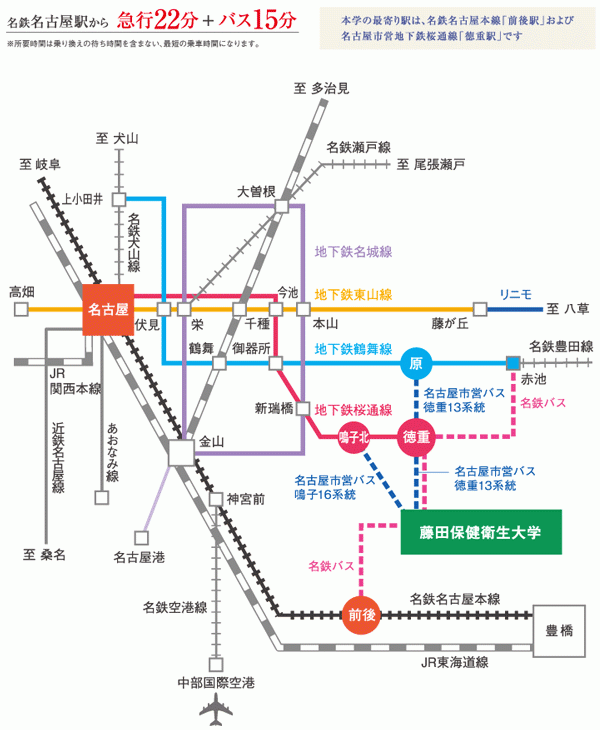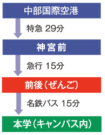 中部国際空港より“金山駅”に直行便(名鉄常滑線 / 空港線)が出ております。金山駅にて名鉄名古屋本線にお乗換え頂き、前後駅で下車してください。
