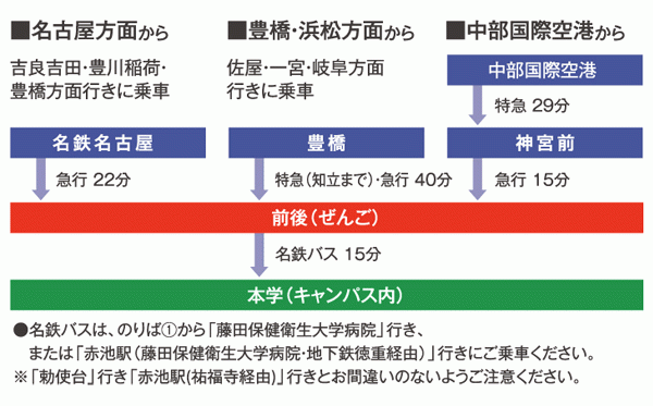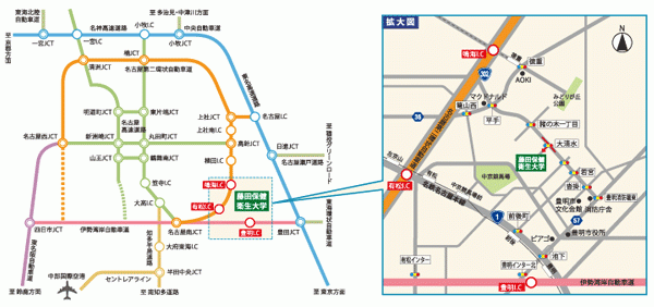 | 有料道路利用 | 名古屋第二環状自動車道「鳴海I.C」から約10分、または「有松I.C」から約15分。伊勢湾岸自動車道「豊明I.C」から約15分(東京方面からの出口) |