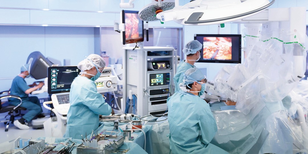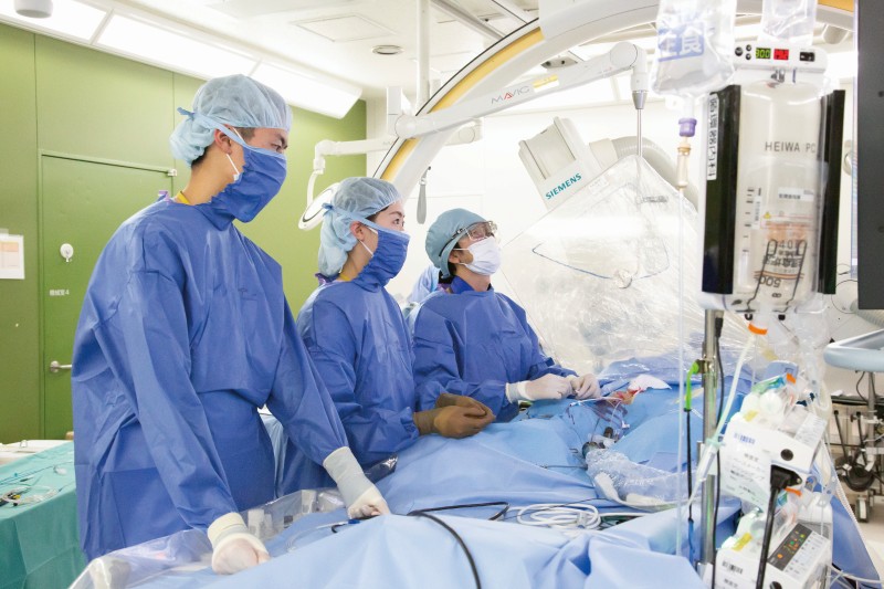 本学大学病院の手術件数は、東海地区でトップクラスを誇ります。手術室は30室。開胸・開腹手術を行うオペ室と同じクリーン度を保ち、万一の場合は直ちに通常の手術に移行できるカテーテル室「ハイブリッド手術室」も、国内最大の5室を備えています。