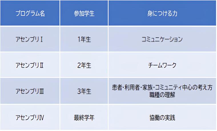 アセンブリ教育は多職種連携に欠かせない力を段階的に身につけられる本学独自の学修プログラムです。