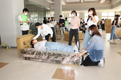 避難所で使用する段ボールベッドや災害用トイレの使用方法、防災食の試食や調理を体験して学びます。また、大学内の防災設備およびその設置場所を確認します。実際の発災時に使用する物品や設備、防災食の特徴を事前に体験・知ることで、発災時に速やかに対応できるようになることを目指します。