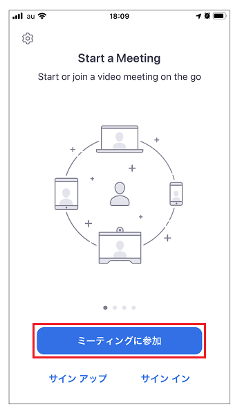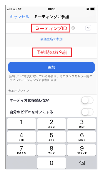 メールに記載されている「ミーティングID」と、ご予約時のお名前を入力いただき、「ミーティングに参加」をタップしてください。