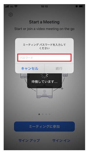 メールに記載されている「パスワード」を入力いただき、「ミーティングに参加」をタップしてください。
