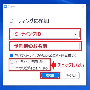 メールに記載されている「ミーティングID」と、ご予約時のお名前を入力いただき、「ミーティングに参加」をクリックしてください。 ※「オーディオに接続しない」「自分のビデオはオフにする」のチェックはしないでください。