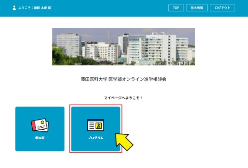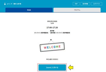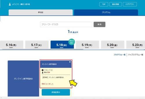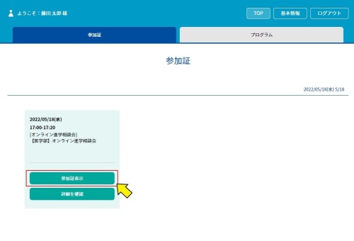 参加証のページから、申し込んだプログラムの「参加証表示」をクリックしてください