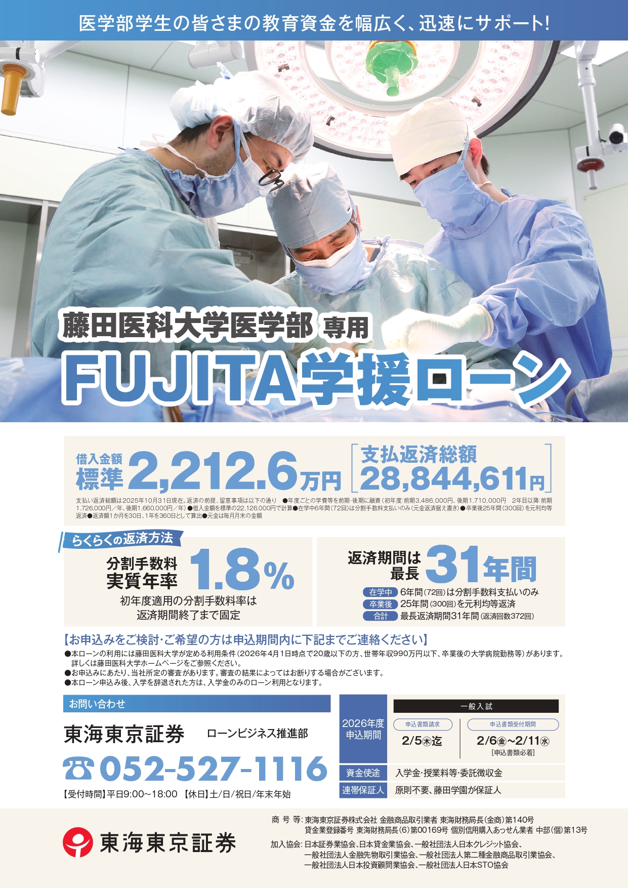 「FUJITA学援ローン」は、藤田医科大学と東海東京証券株式会社が提携する医学部新入生対象の教育ローンです。このローンでは、藤田医科大学が連帯保証人となることで、分割手数料率(実質年率)1.8%で6年間の学費と委託徴収金の全額にあたる2,212.6万円の融資を受けることができます。