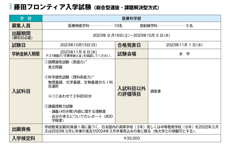 医療科学部 藤田フロンティア入試(総合型選抜)