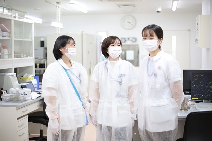 彼女たちは同じ微生物遺伝子検査室のかわいい後輩です。検査室のスタッフは彼女らを含めて十数人。みなさん私にとってかけがえのない存在です。ここには毎日大量の検体が届きますが、とくに新型コロナが流行してからはその検査も行っているので、1日中、目が回るような忙しさです。そんな中でも「あの検査が大変そうだから手伝おう」とか、話し合ったわけでもないのにあうんの呼吸で助け合いながら手際よく、効率よく動けるのは、やっぱり思いやりがあるからなんですよね。頼りになる先輩方や、支えてくれる同期、日々努力を惜しまない後輩たちの姿は私の原動力ですね。